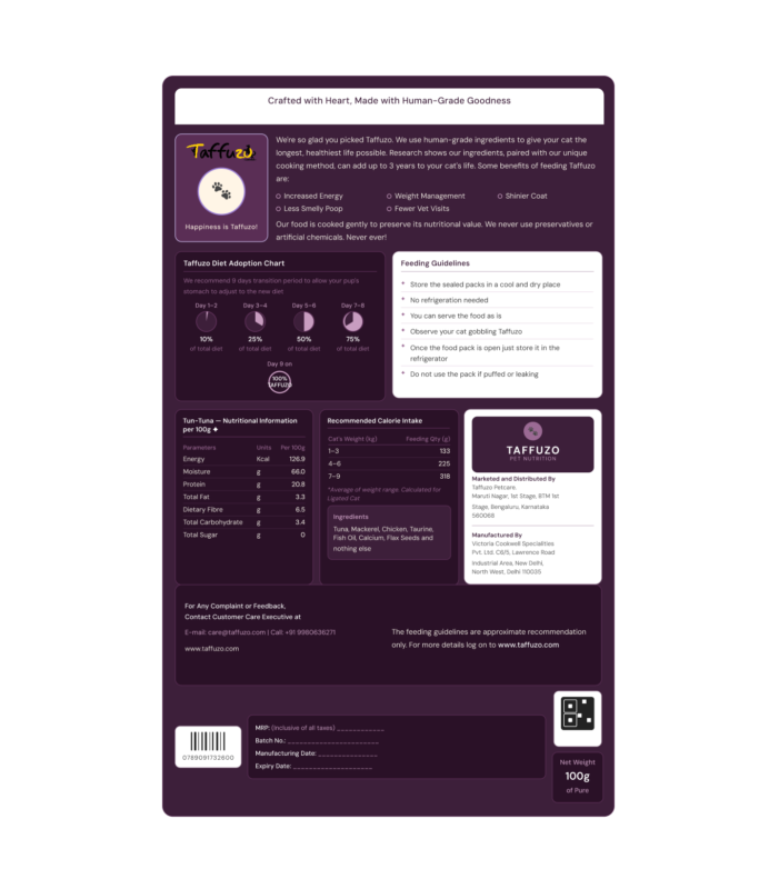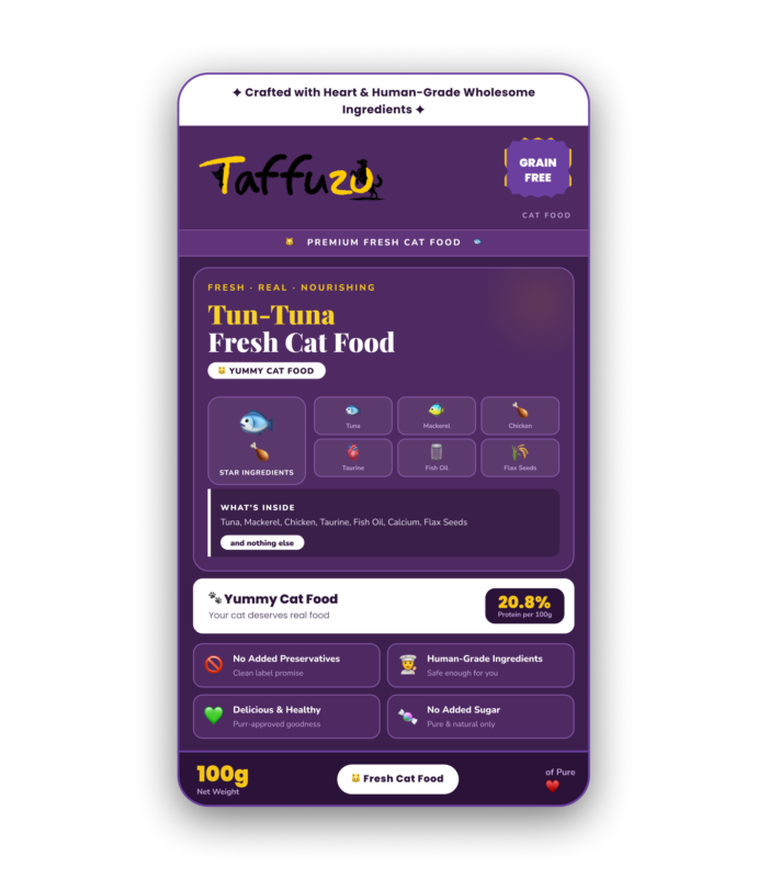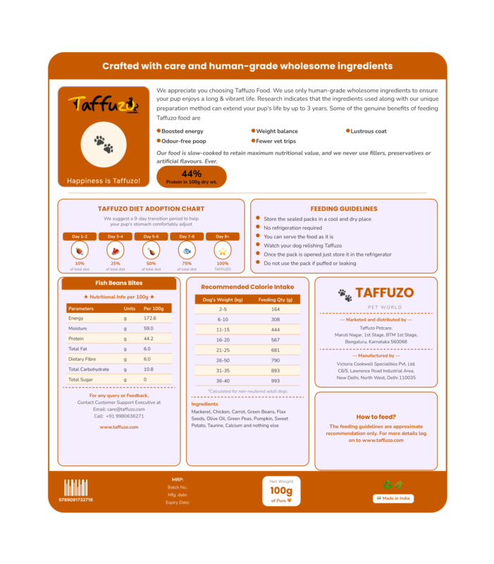 Unlike most commercial pet food, Taffuzo loads up on fillers, sneaky sugars, and preservatives. But that's exactly the opposite of what we do. Clean ingredients, honest recipes, zero compromise.