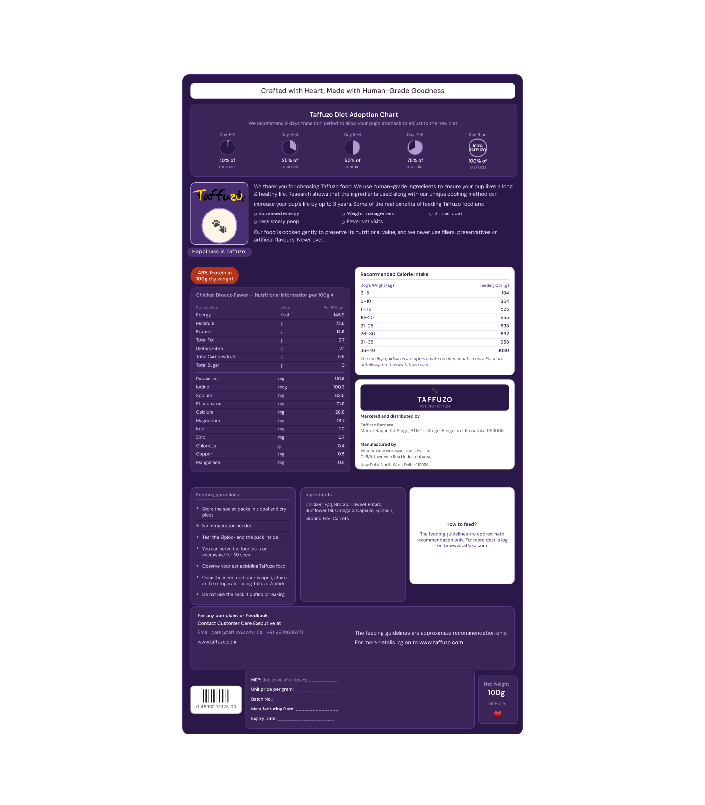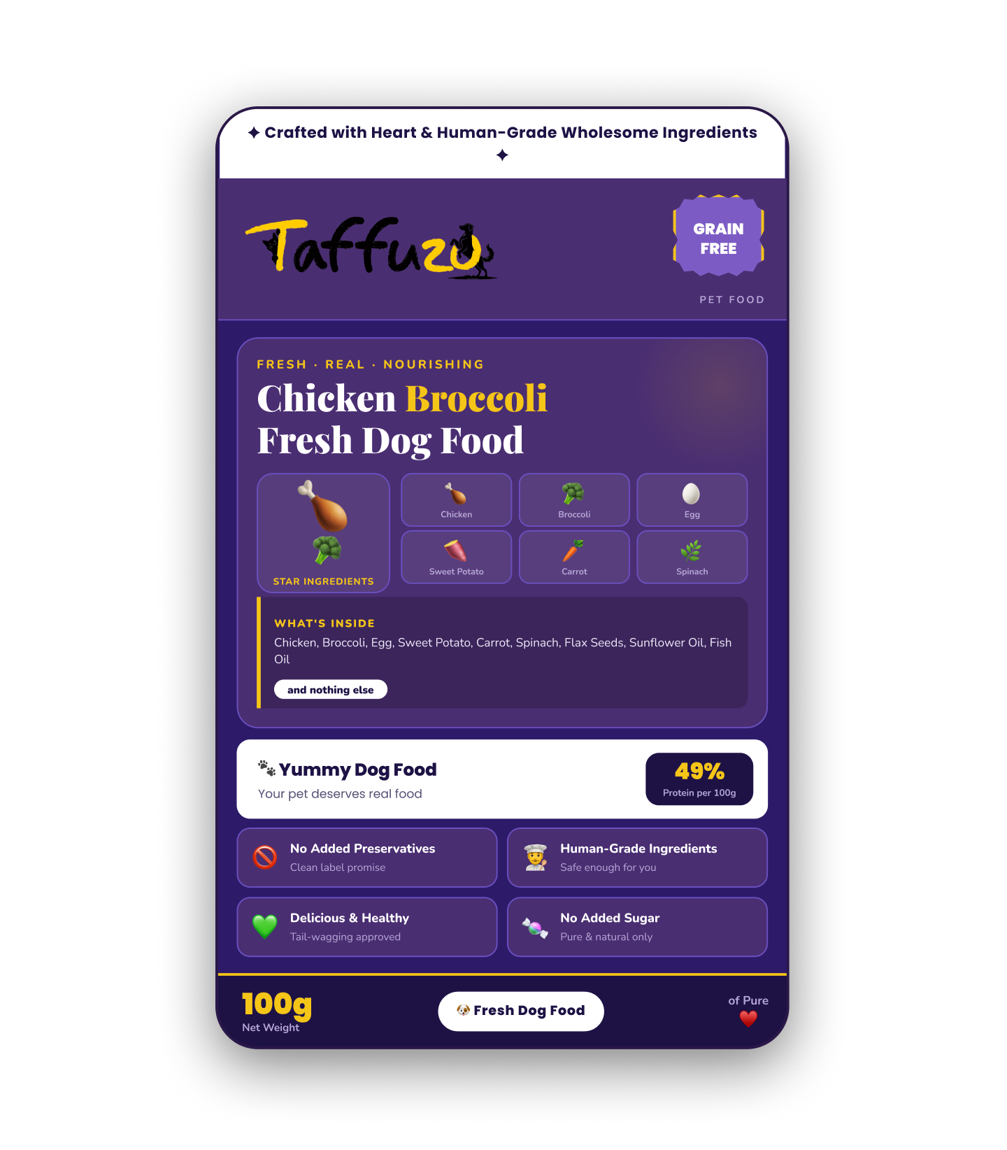 Taffuzo Chicken & Broccoli Fresh Dog Food contains Chicken Breast, Broccoli, Egg, Sweet Potato, Carrot, Spinach, Flaxseeds, Cold-pressed Sunflower Oil, and Fish Oil.