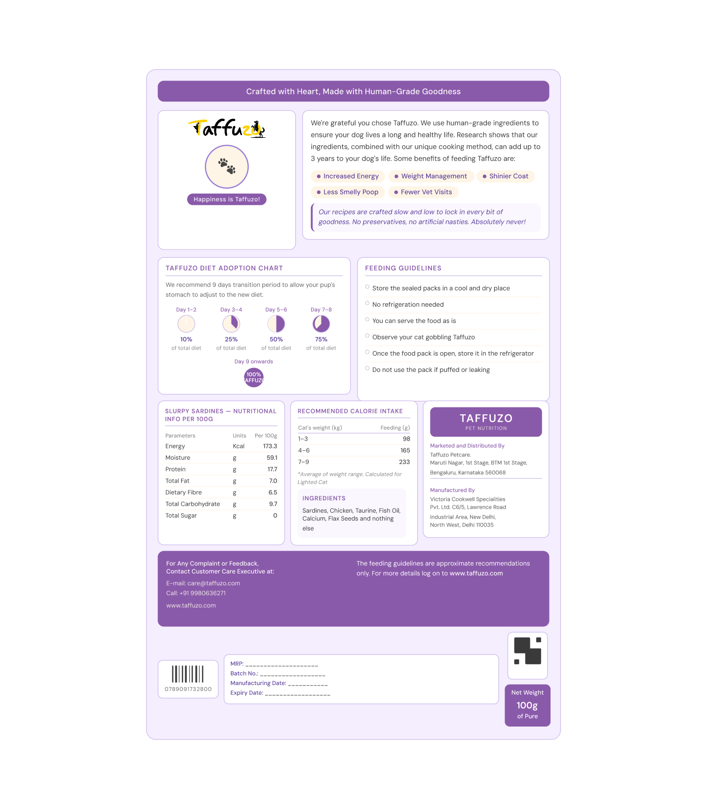 | Ingredients | Sardines, Chicken, Taurine, Fish Oil, Calcium, Flax Seeds |